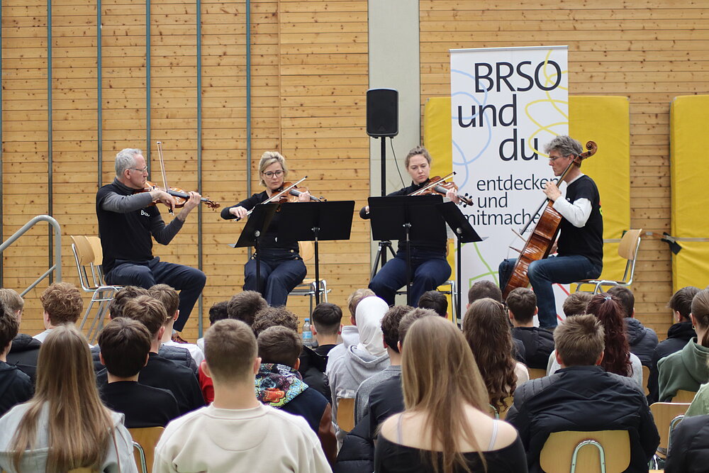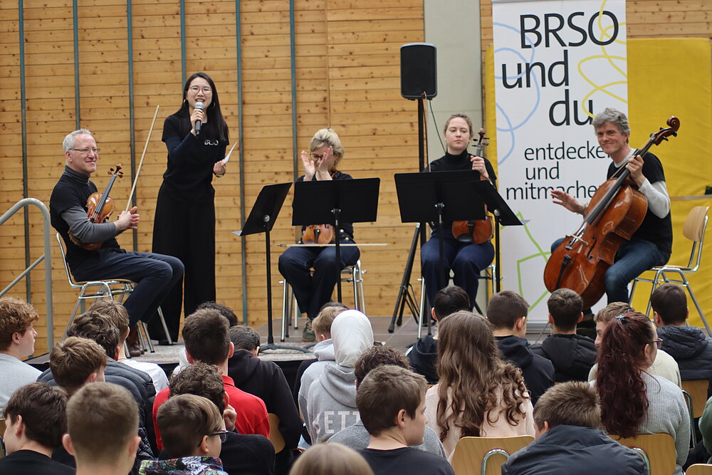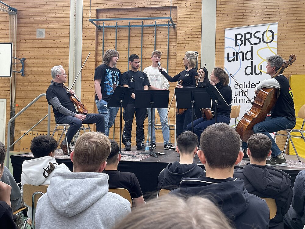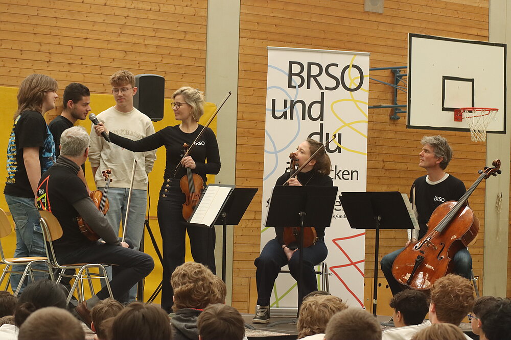 Malte Arkona führte dann gewohnt informativ, unterhaltsam und humorvoll in die dargebotenen Stücke ein und stellte so gekonnt Bezüge zwischen den Musikstücken und der Lebenswelt der Schüler her.